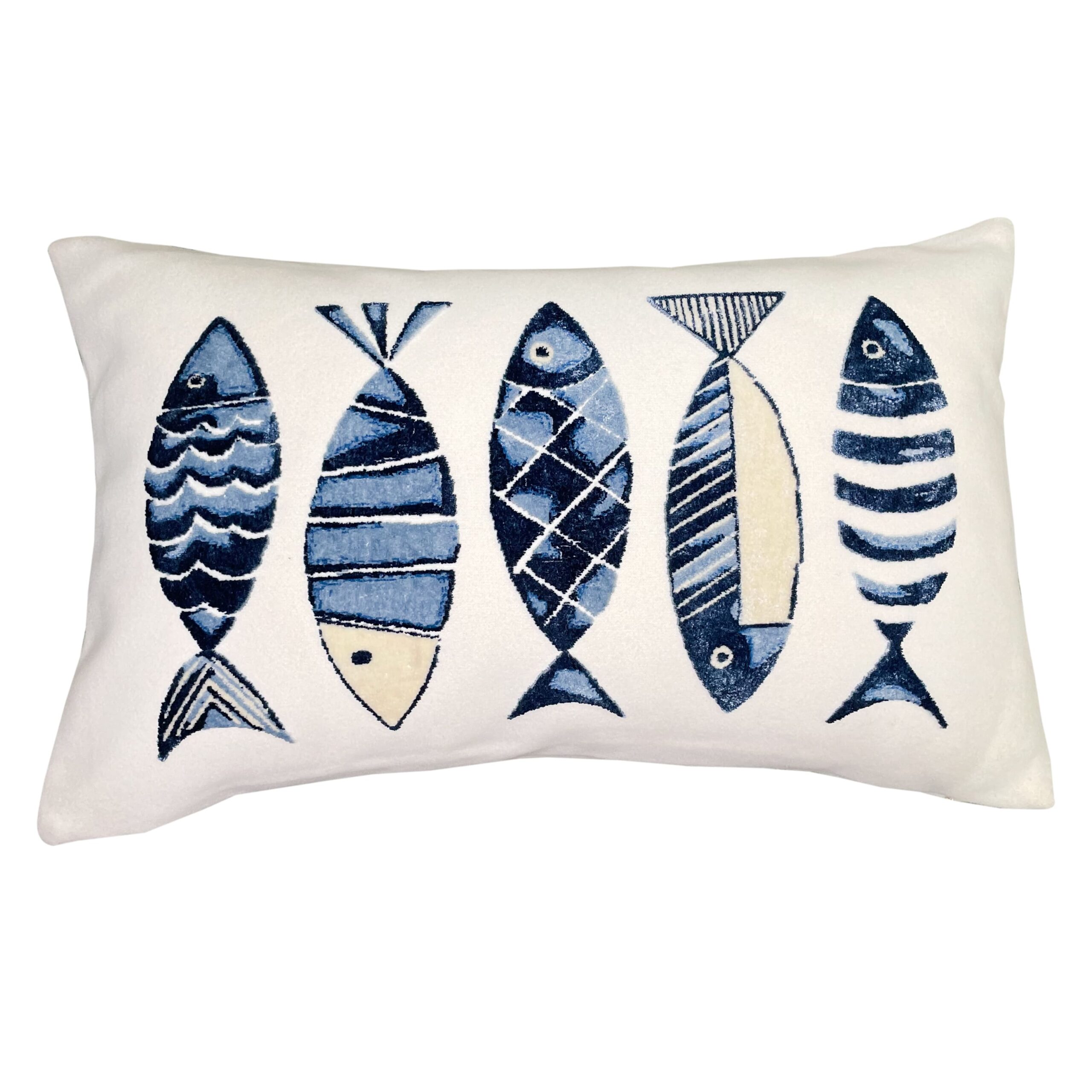 EMBROIDERED BLUE FISH ON WHITE CUSHION